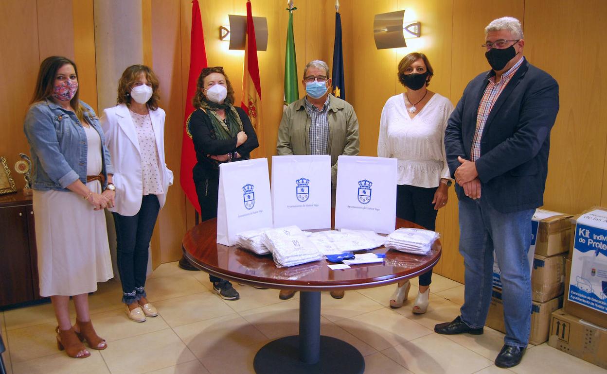 José Manuel Prieto, alcalde, junto a Elisa González Pedraza y Lola Aguayo, responsables de Salud y Educación respectivamente, han entregado los correspondientes kits a los representantes de los colegios Mariana Pineda y Nuestra Señora de las Angustias, y del IES Los Neveros, para que sean ellos quienes los distribuyan entre el alumnado en los próximos días.