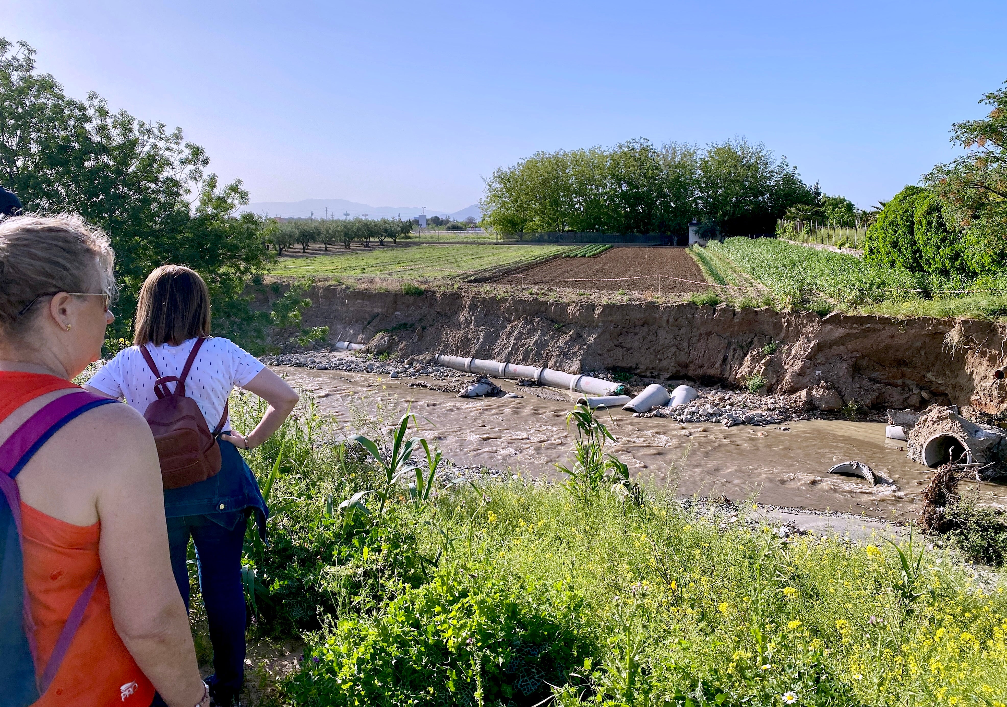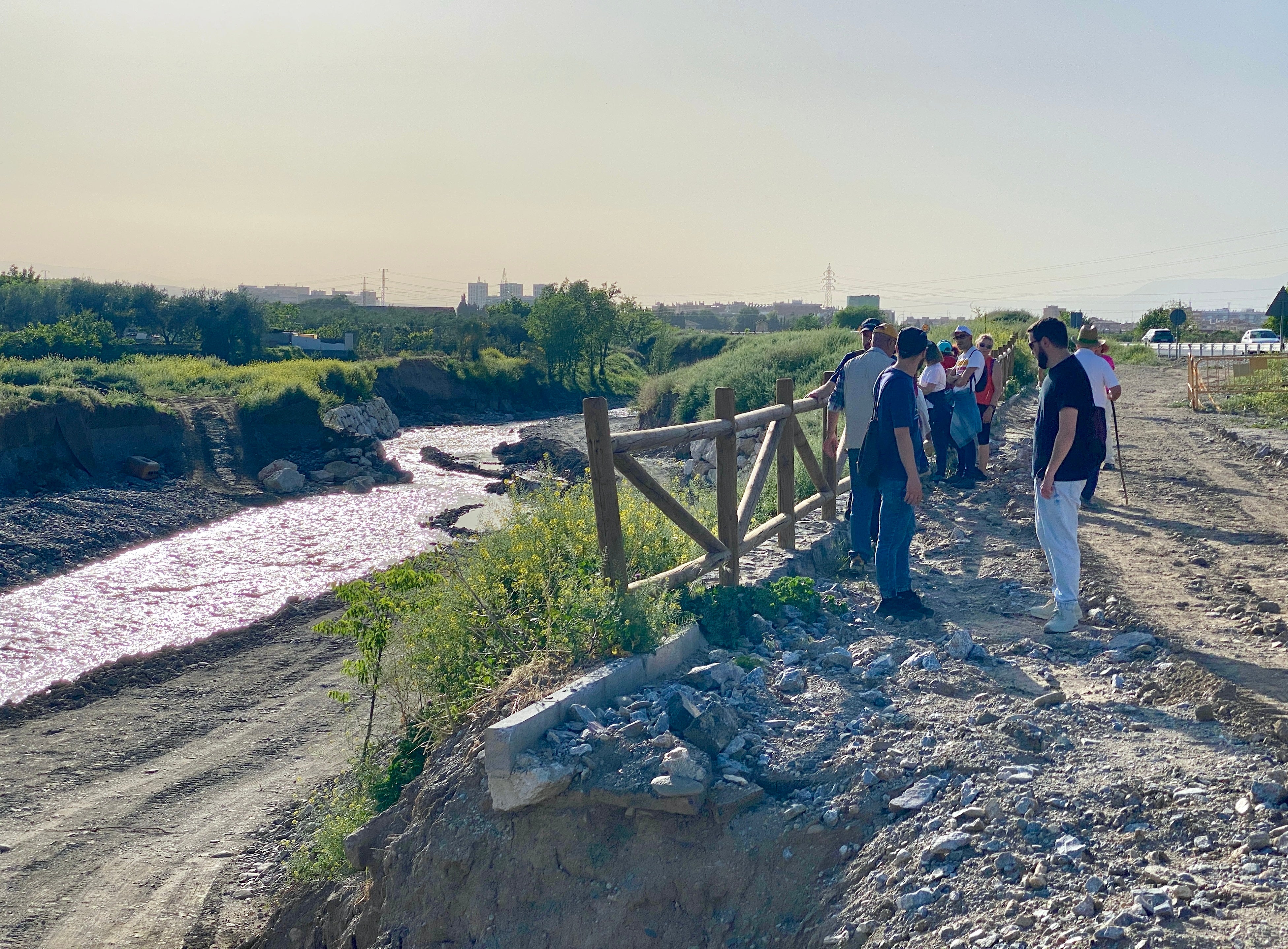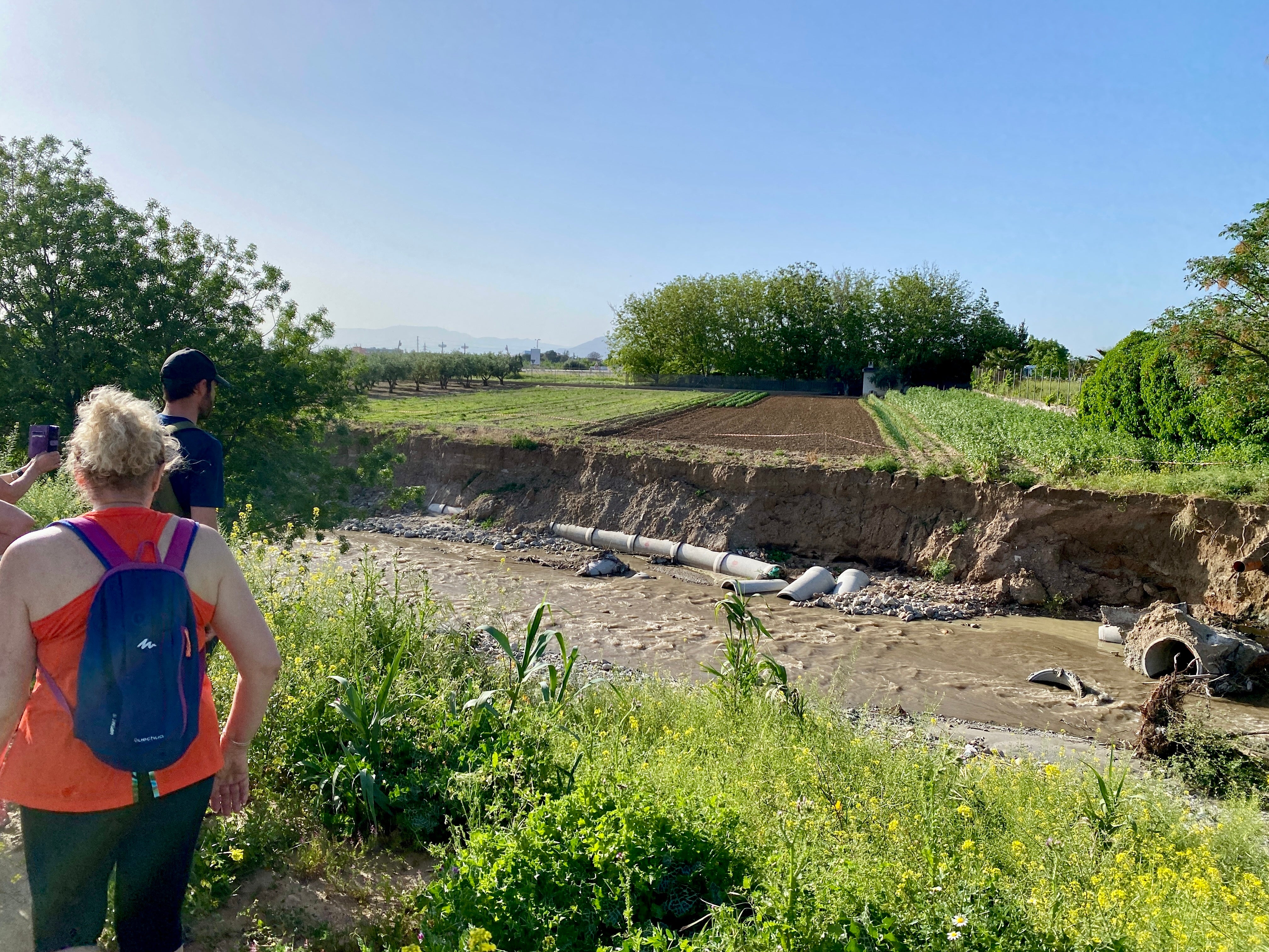 El grupo tuvo la oportunidad de observar de primera mano los destrozos provocados por aquellos temporales, en especial en el trecho por Huétor Vega, que han obligado a la Confederación Hidrográfica del Guadalquivir (CHG) a retrasar la finalización de los trabajos en esta senda de algo más de cinco kilómetros. Los daños fueron generalizados en toda la traza de la obra, y afectaron tanto a la margen donde estaba prevista la implantación del nuevo sendero como al lado contrario.