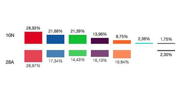La subida rotunda de Vox ha tenido reflejo en la localidad metropolitana, donde se sitúa como tercera fuerza más elegida para el Congreso (21,39%, 1.405 votos; siete puntos por encima que en abril), empatando con el PP, segundo prácticamente con el mismo respaldo (21,68%, 1.424 votos; cuatro puntos más que hace siete meses).