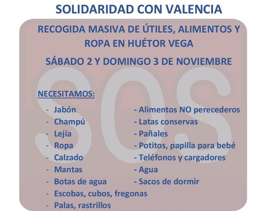 El Ayuntamiento de Huétor Vega ha hecho un llamamiento a la ciudadanía para participar este fin de semana en la recogida masiva de útiles, alimentos ... y ropa para las personas afectadas por la DANA. El punto de referencia es la sede de Protección Civil (calle Real, 28), con horario intensivo este sábado y domingo, de 9 a 21 horas.