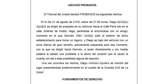 Los hechos ocurrieron el 21 de agosto de 2015, sobre las 21.40 horas, cuando Diego se trasladó «a propósito» en su vehículo hacia el Café París de Huétor Vega. El acusado se paró al encontrarse con un amigo y, en ese momento, Germán, que se hallaba en el interior del bar, salió a fumarse un cigarro. De acuerdo con el relato de hechos probados, Diego «se bajó del vehículo con un arma blanca de gran tamaño, previamente preparada para ese momento, con la que se dirigió hacia Germán». Le atacó «directamente y sin mediar palabra». Le asestó una puñalada a la altura del corazón que le causó la muerte, «sin dar a este posibilidad alguna de reacción».