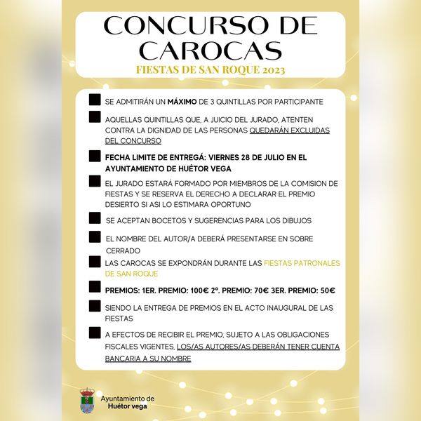 El concurso de carocas que organiza el Ayuntamiento de Huétor Vega es la señal de que las fiestas patronales del municipio ya se acercan, porque ... San Roque viene en agosto. Se admitirán un máximo de tres quintillas por participante y la fecha límite de entrega, en el Consistorio, es el 28 de julio. Se repartirán tres premios con dotación económica.