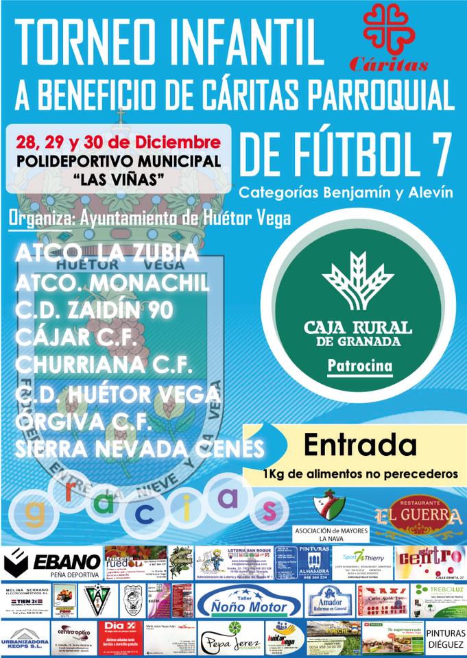 Mañana viernes 28 de diciembre comienza en el polideportivo municipal Las Viñas de Huétor Vega un torneo infantil a beneficio de Cáritas Parroquial. Organizado por ... el Ayuntamiento de la localidad, se trata de un campeonato que se inicia a las 9:30 horas y que se extenderá durante todo el fin de semana, hasta el 30 de diciembre. Su peculiaridad es que la entrada para poder acceder al mismo será un kilo de alimentos no perecederos. Lentejas, garbanzos, azúcar, galletas o pasta servirán para entrar a ver el torneo.