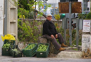 Miguel pasa la mañana sentado. Los coches evocan el estrés de la vida cualquier día laboral. Pero su mirada se pierde en la vega hueteña. Como si esa tierra le susurrara todo el tiempo. Estaciona su vehículo un almeriense que le compra seis kilos de habas verdes. Miguel las vende con gesto iluminado. Así es y así será, al menos, mientras dure el campo.