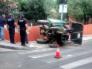 El operario, que no ha sufrido daños, tropezó con el bordillo de la acera y el vehículo industrial impactó contra la pared del centro escolar ... según bajaba.